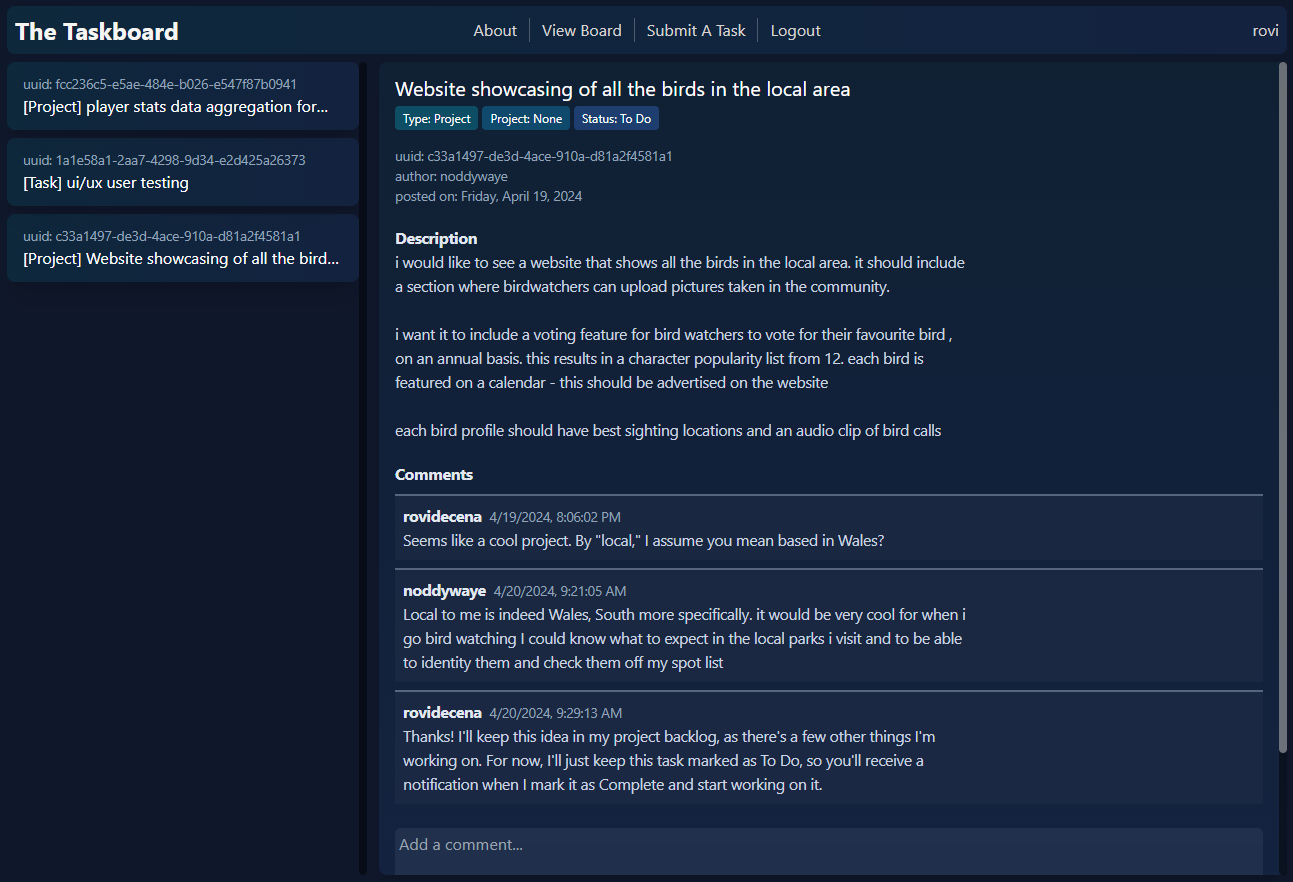 Outside of the tasks, there's also a comment section within each task. The intended purpose of the comments is to give feedback between me and the person submitting the task, maybe clarifying why I approved/rejected a task, and letting them know on any status updates.